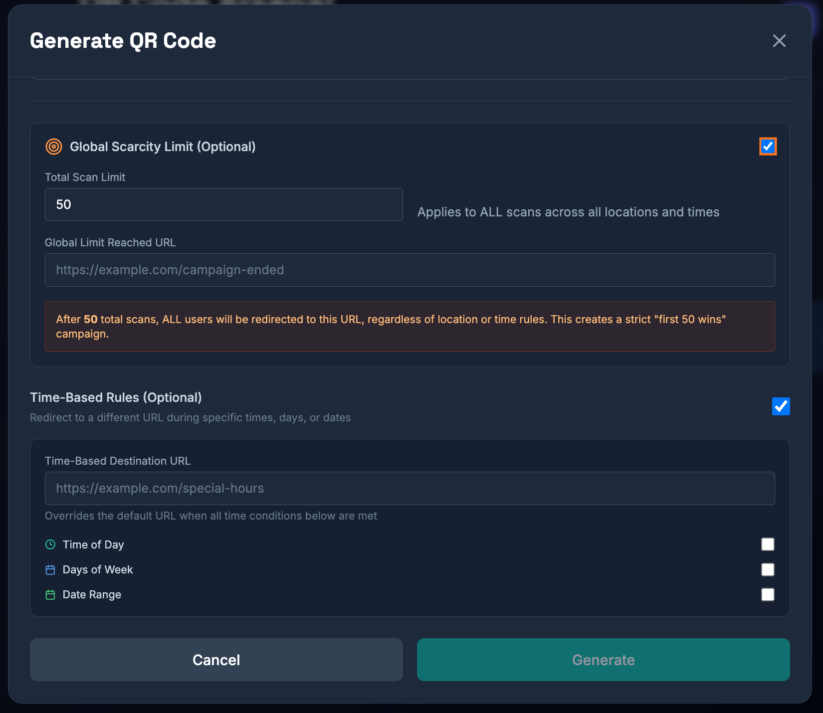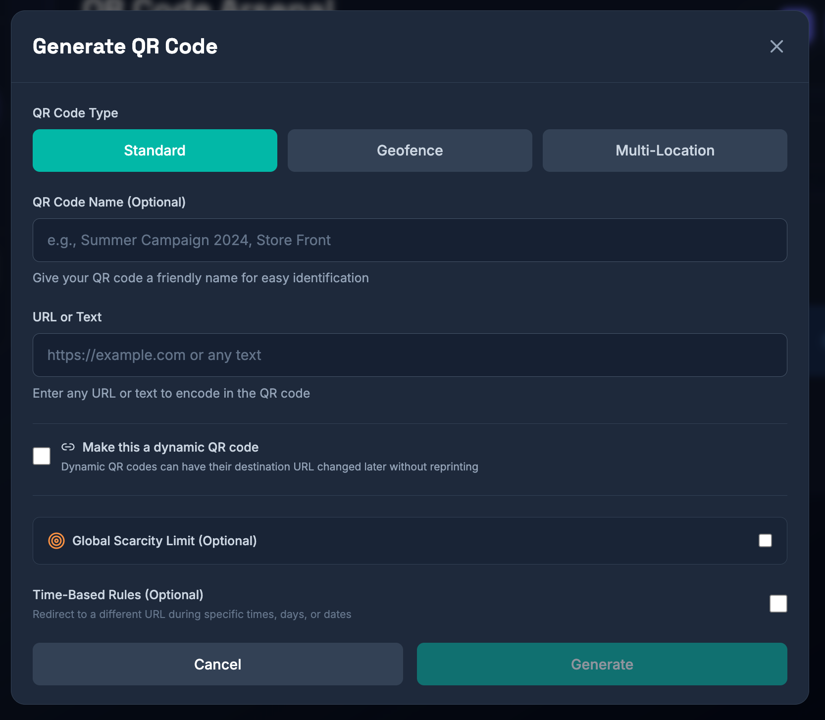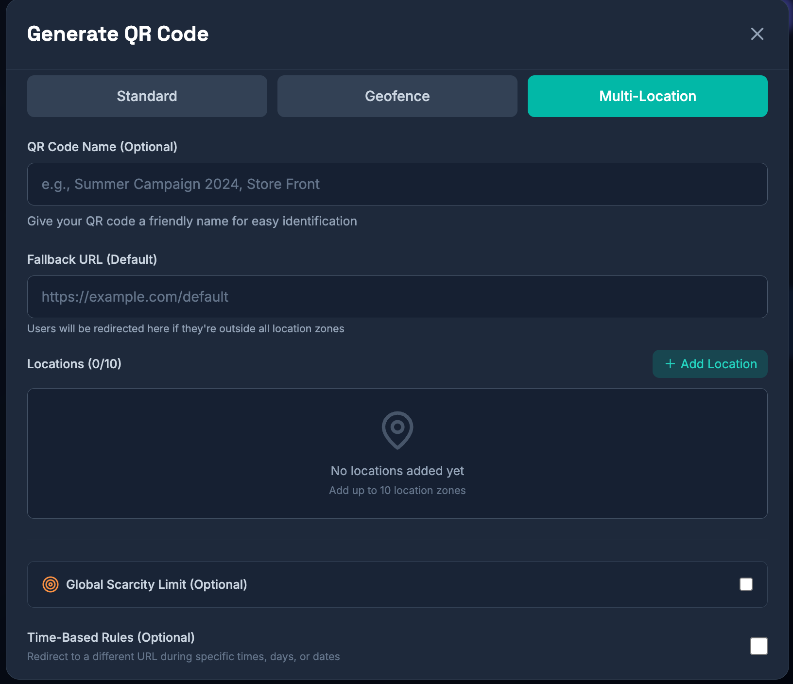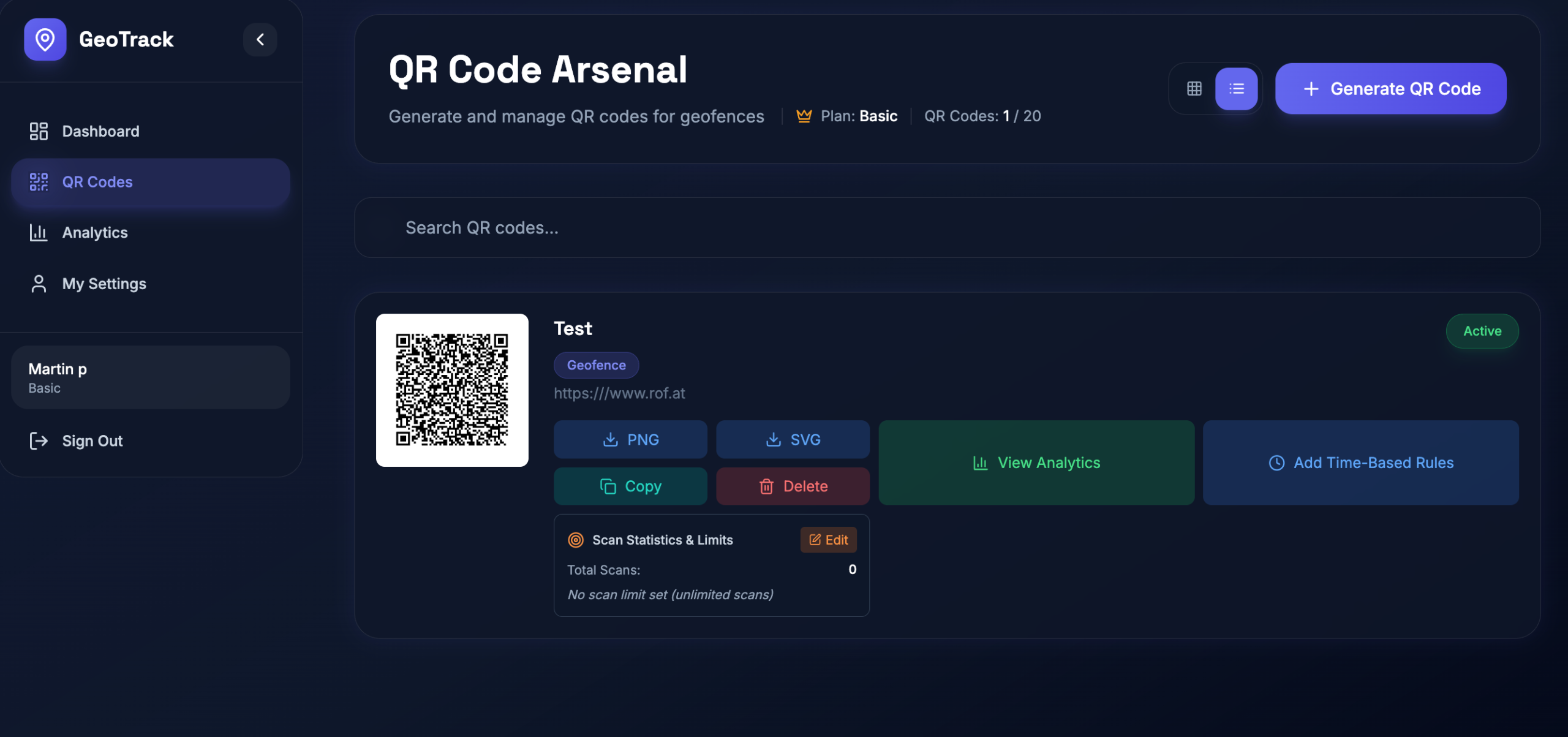 A comprehensive platform for creating, managing, and tracking dynamic QR codes with powerful geofencing and time-based routing capabilities.