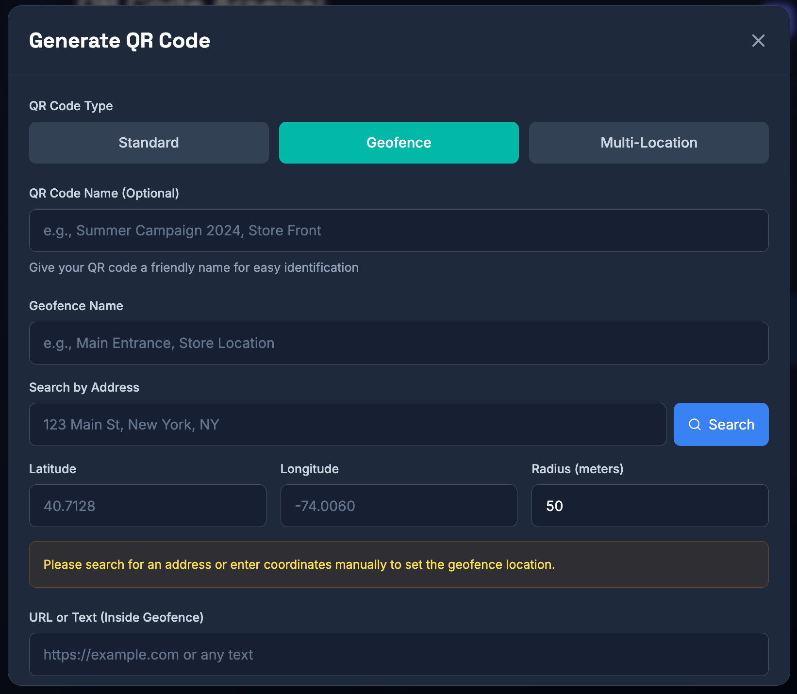 Join thousands of businesses using geofencded QR Codes to create smarter, location-aware QR experiences.